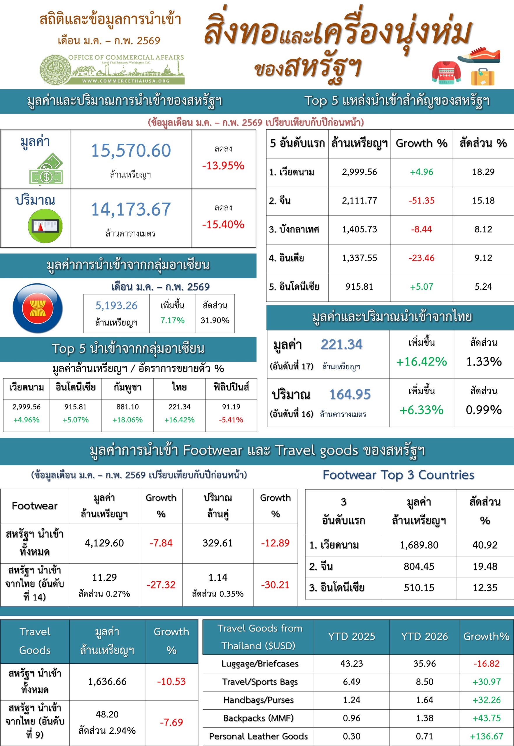 รายงานสรุปการนำเข้าสิ่งทอและเครื่องนุ่งห่มของสหรัฐอเมริกา (Infographic, PDF) 1 หน้าหนังสือ สำหรับเดือนอื่น ๆ Link Post navigation U.S.-Thai Trade Report for April 2026 (Infographic, PDF) with Jan-Feb Data